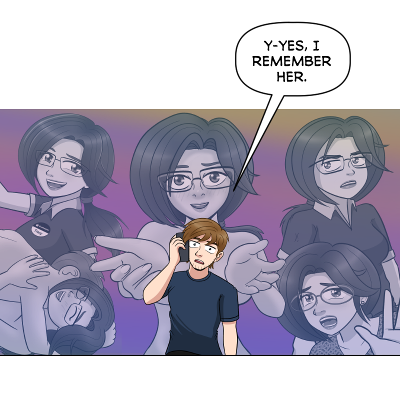(Memories of Tracy surround Nate as he looks on in shock - Tracy teasing Nate in her Food Baron uniform, Nate and Tracy in bed together, Tracy with her arms outstretched towards the camera, Tracy looking pissed, Tracy crying)