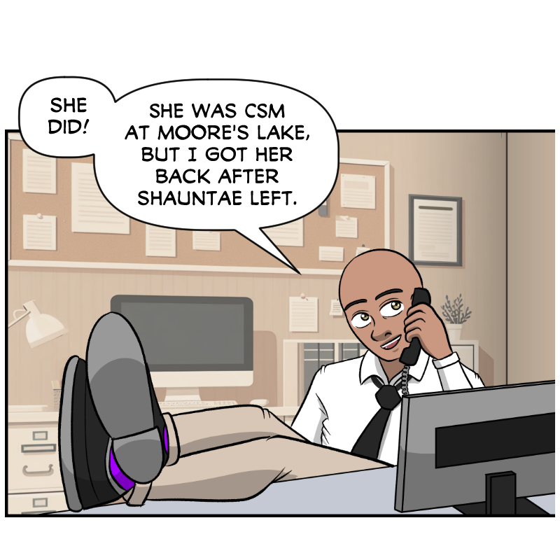Corbin (more relaxed now, with his feet resting on a desk in the Food Baron office): She did! She was CSM at Moore's Lake, but I got her back after Shauntae left.