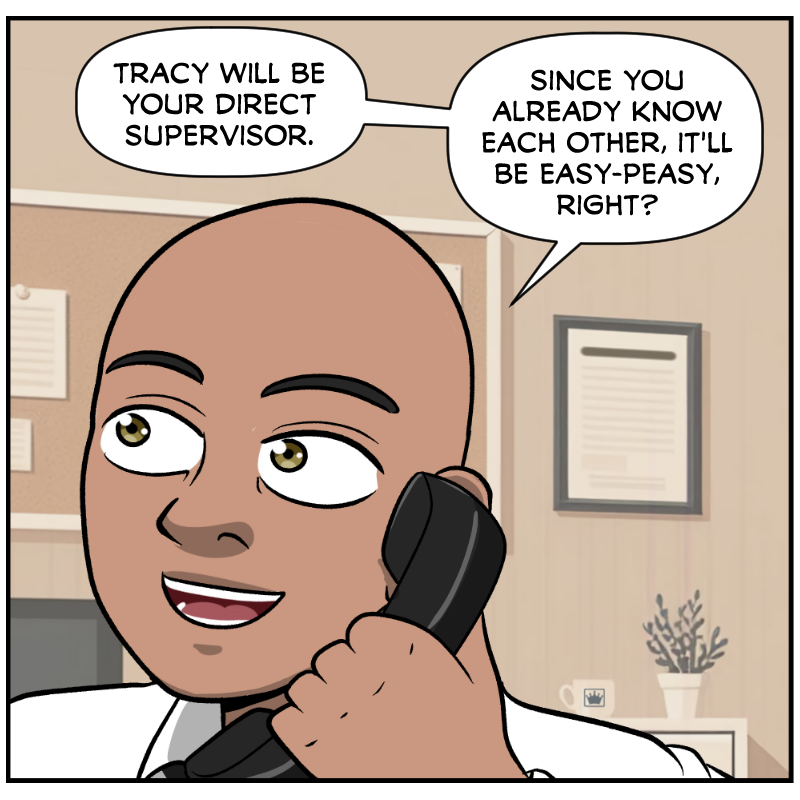Corbin: Tracy will be your direct supervisor. Since you already know each other, it'll be easy-peasy, right?