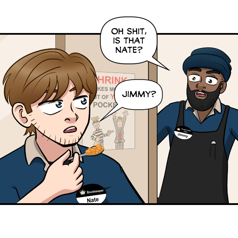 (EXTERIOR, BREAKROOM, LOOKING IN: Nate is eating some deli food in the break room, as Jimmy approaches from outside the room.)