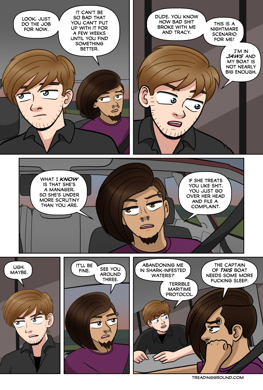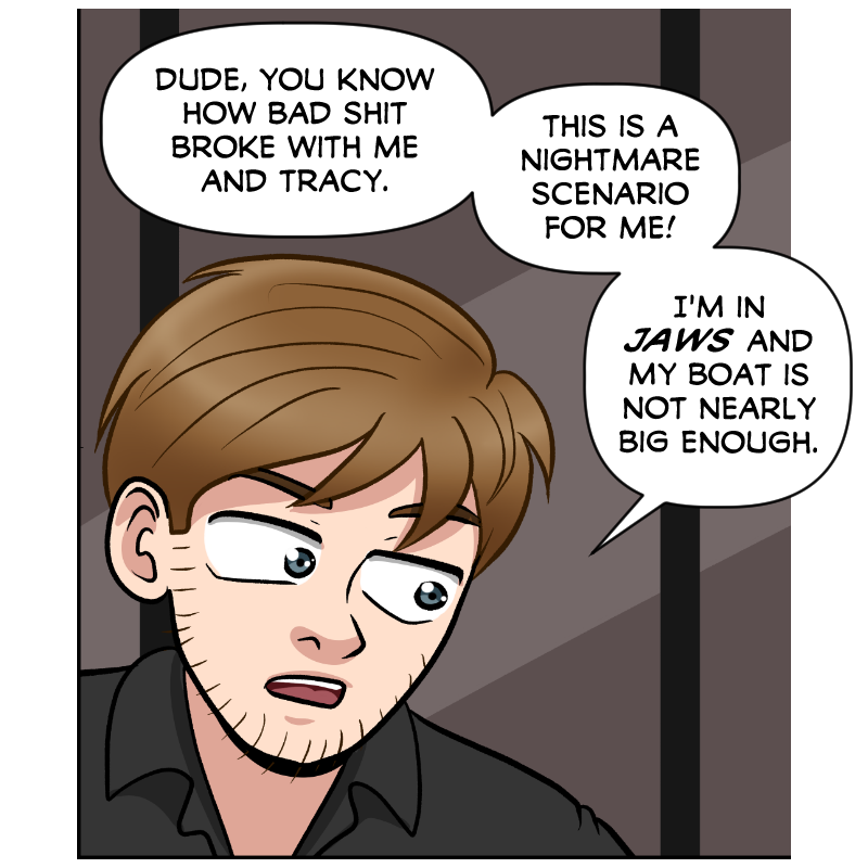 Nate: Dude, you know how bad shit broke with me and Tracy. This is a nightmare scenario for me! I'm in JAWS and my boat is not nearly big enough.