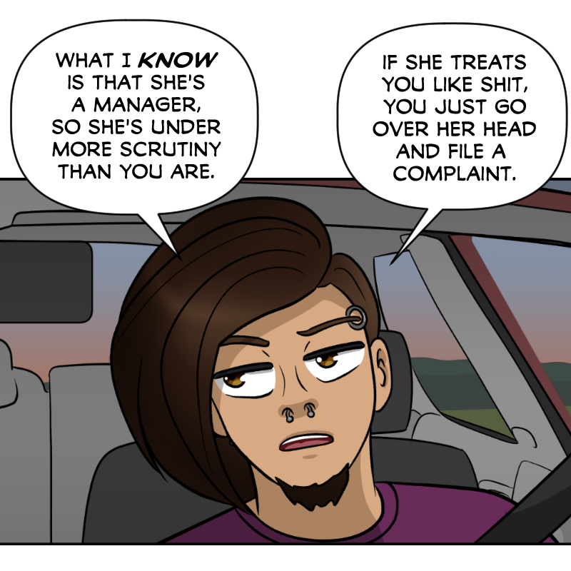 Steve: What I know is that she's a manager, so she's under more scrutiny than you are. If she treats you like shit, just go over her head and file a complaint.