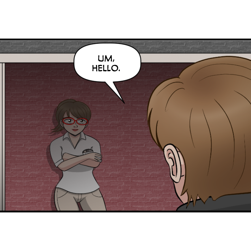 (From-behind shot of Nate approaching Tracy, who is shrouded in darkness, standing under the eave outside the store)