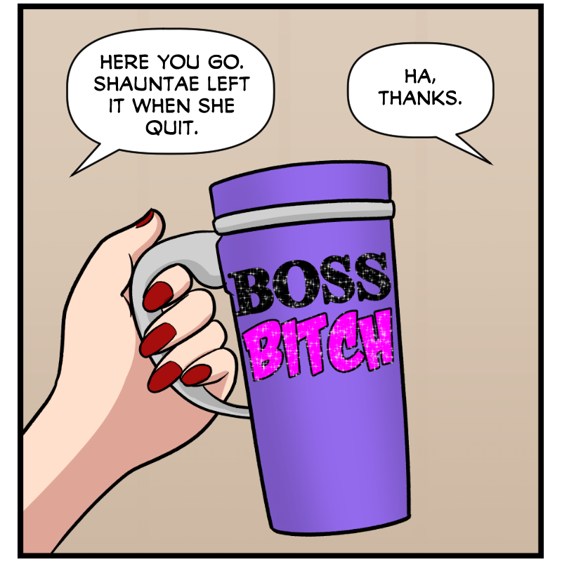 (Close-up of Tracy handing Nate a sparkly tumbler with "Boss Bitch" on it)